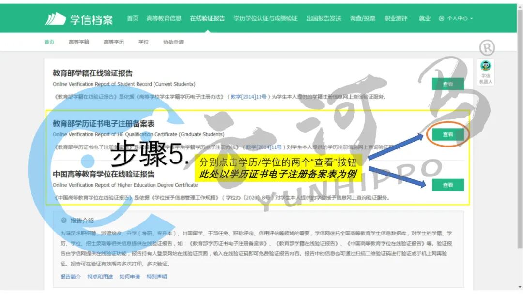 登录后点击“在线验证报告”,根据您的查询要求点击分别点击“学历”或者“学位”进行查询。