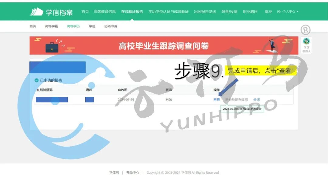 完成申请点击“查看”并“下载”。