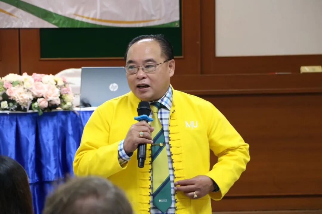 2025年9月18日,星期四,湄州大学举办了2025年度退休人员感恩典礼"#感恩之情_百颗心编织湄州人之情谊",旨在表达感谢,认可所有员工的重要性与奉献精神,并共同致敬圆满完成任期退休的前辈们,他们对组织和社会做出了贡献。典礼荣幸地邀请到湄州大学校长威拉蓬·通玛副教授博士担任主席并致辞,向退休人员表达感谢和祝福,同时颁发荣誉奖牌。湄州大学副校长吉迪萨·锡恩扬副教授博士报告了本次活动概况。今年共有34名人员退休。